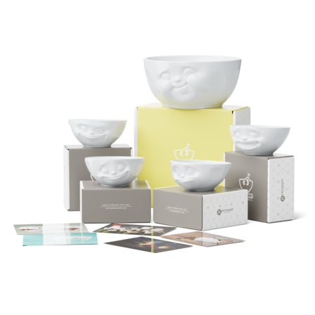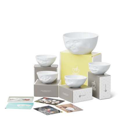 Our Munching Combo contains the big Bowl MUNCHING, all of our 4 350 ml bowls GRINNING, HAPPY, TASTY and LAUGHING + 5 Postcards*