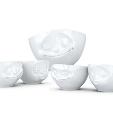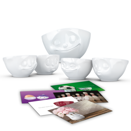 Mother's Day Special: 500 ml bowl "Happy" white, small bowl set white no. 1 "Kissing & Grinning" and small bowl set white no. 2 "Happy & Dreamy" plus 5 postcards.
