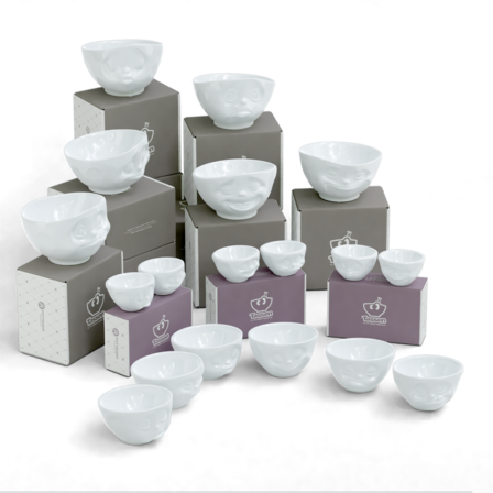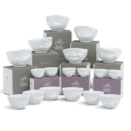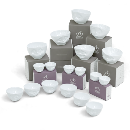 6 x bowl 1 each GRINNING, SULKING, KISSING, HAPPY, TASTY and LAUGHING (500 ml); 6 bowls in 3 medium bowls sets no. 1, no. 2 and no. 3 KISSING & GRINNING, HAPPY & OH PLEASE! and TASTY & SNOOZY (200 ml); 6 small bowls in 3 small bowl sets no. 1, no. 2  and no. 3 KISSING & GRINNING, DREAMY & HAPPY and LAUGHING & TASTY