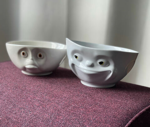 Back then, product recommendations came from all sides and we had wild ideas about what we could do. Animated wallpaper, lampshades, stools..., anything is possible if you let your imagination run free. But on the face of it, it was already there, the inner compass that still guides us today, and therefore we reached an early decision on the laid table and a matching product family. So it began with the 500ml bowls GRINNING and SULKING.
